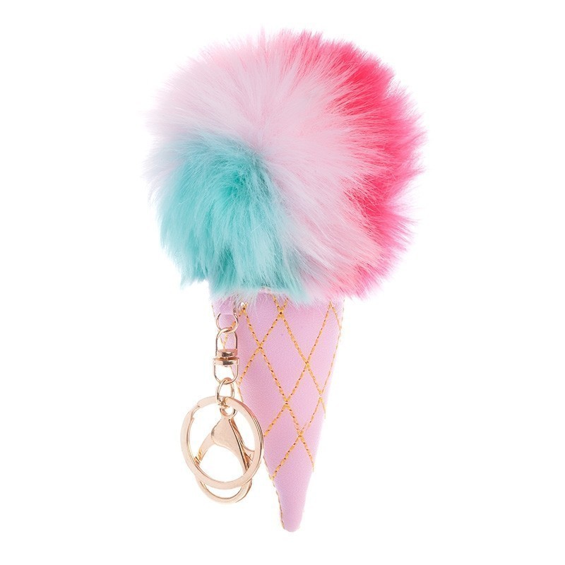 Παγωτό χωνάκι με βάση από pvc ροζ και φούντα πολύχρωμη , δεμένο σε μεταλλικό χρυσό μπρελόκ. Ιδανικό για διακοσμήσεις,κατασκευές και ως δώρο