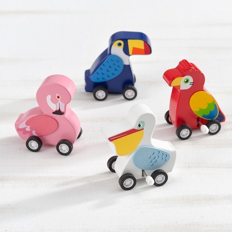 Ξύλινα πολύχρωμα παιδικά παιχνίδια κουρδιστά και κινούμενα με σχέδια τροπικών πουλιών.Ο κωδικός περιλαμβάνει 4 σχέδια(Πελεκάνο,Φλαμίνγκο, Παπαγάλο, Toucan).Για ηλικίες άνω των 3 ετών