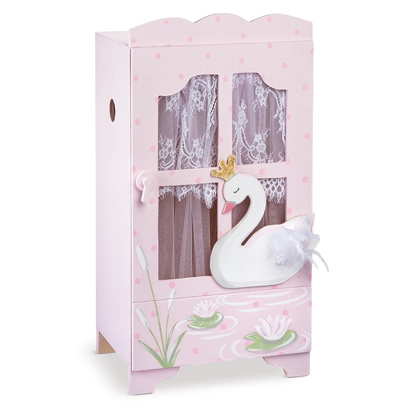 Ξύλινη natural βιτρίνα-ντουλαπίτσα με διακοσμητικό συρταράκι,συσκευασία βάπτισης ζωγραφισμένη στο χέρι με λιμνούλα γεμάτη νούφαρα και διακοσμημένη με ξύλινο λευκό κύκνο ο οποίος φαίνεται να κολυμπάει στη λιμνούλα.Την ντουλαπίτσα διακοσμεί επίσης κουρτινούλα από τούλι ροζ και δαντέλα λευκή.
