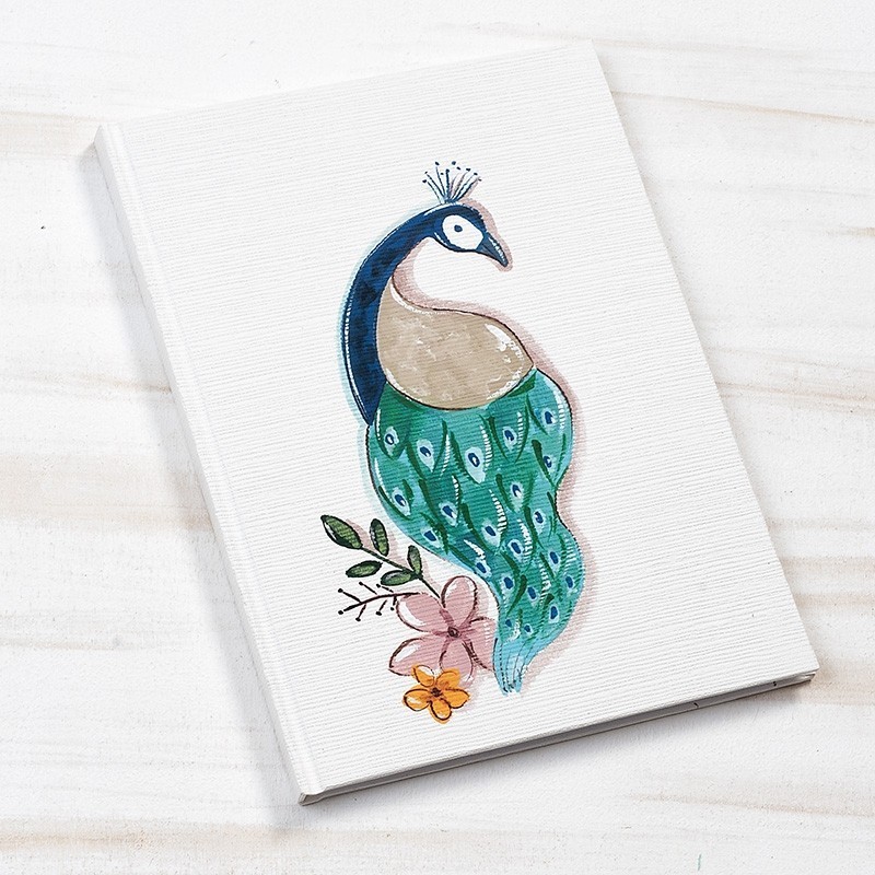Βιβλίο ευχών λευκό εξωτερικά από χοντρό χαρτόνι,ζωγραφισμένο στο χέρι με θέμα το παγώνι σε βεραμάν-μπλε αποχρώσεις.