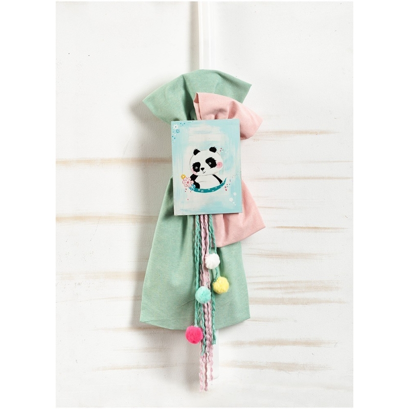 Η λαμπάδα είναι διακοσμημένη με ξύλινη παράσταση που απεικονίζει ένα αξιαγάπητο panda. To δέσιμο αποτελείται από δυο υφασμάτινους φιόγκους σε βεραμάν και ροζ χρώμα ενώ τα βαμβακερά κορδόνια και τα pom pom, που κρέμονται στο μπροστινό κομμάτι, αποτυπώνουν την παιχνιδιάρικη διάθεση.