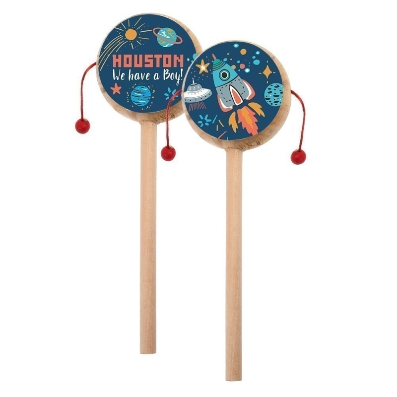 Ξύλινο natural τυμπανάκι με αυτοκόλλητο print Διάστημα με διαφορετικό σχέδιο μπρος-πίσω.