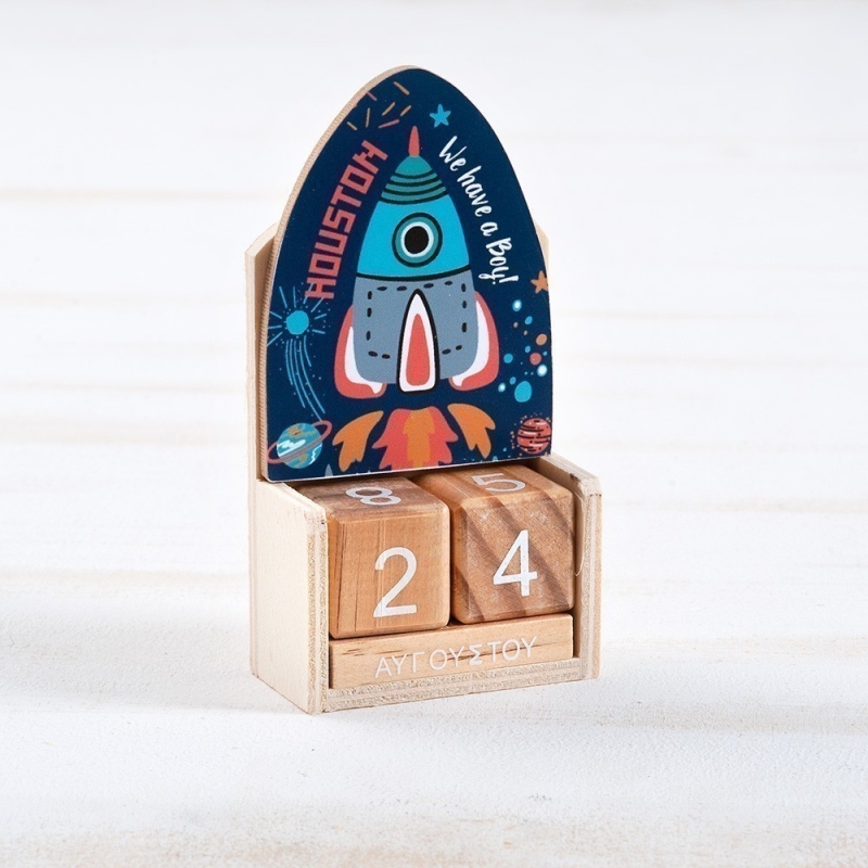 Ξύλινο ημερολόγιο με κύβους σε natural χρώμα. Διακοσμημένο με κοπτικό Διάστημα.