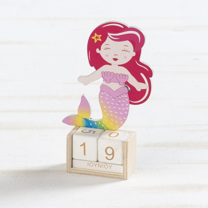Ξύλινο natural ημερολόγιο με δυνατότητα αλλαγής της ημερομηνίας προσαρμόζοντας τα κυβάκια. Είναι διακοσμημένο με ξύλινη παράσταση γοργόνα σε αποχρώσεις του ροζ.