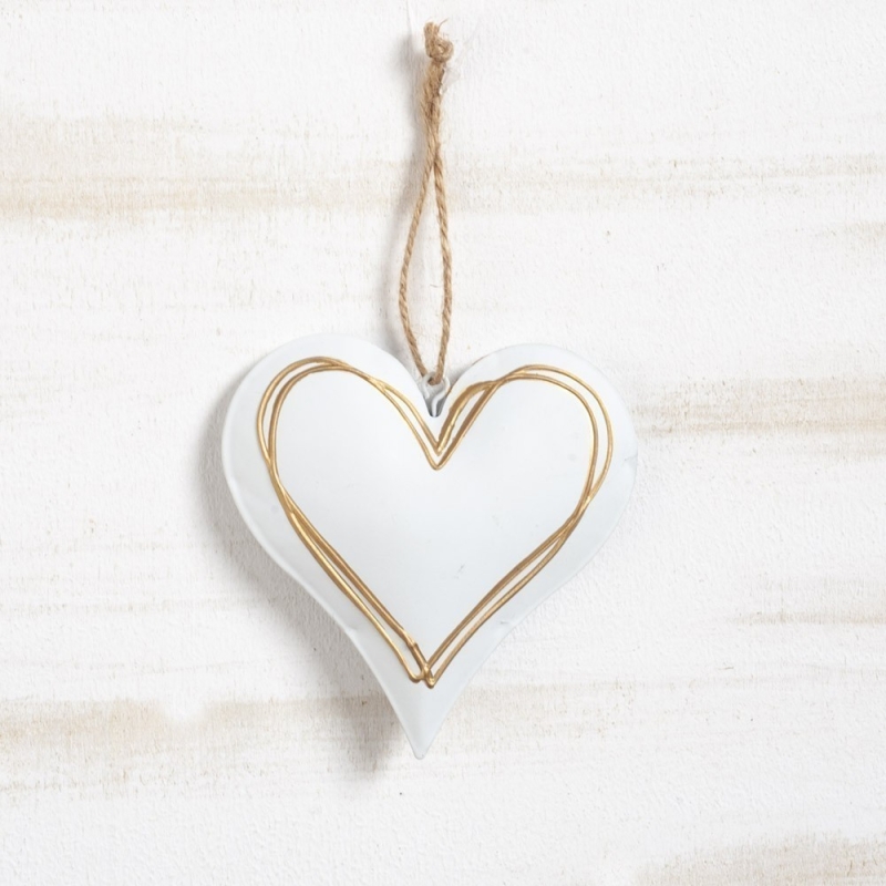Μεταλλική 3d κρεμαστή καρδιά λευκή με χρυσό ανάγλυφο περίγραμμα