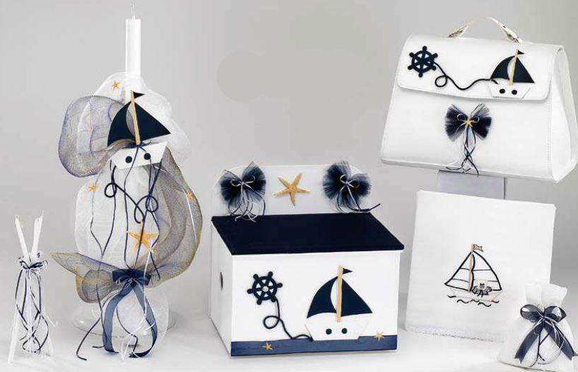 Σετ Βάπτισης με θέμα θαλασσινό σε διάφορες αποχρώσεις το οποίο περιλαμβάνει μπαουλάκι ξύλινο ή βαλίτσα, λαδόπανα, σετ λαδικού και λαμπάδα. Μπορείτε να επιλέξετε αν θέλετε ξύλινο μπαούλο ή βαλίτσα.