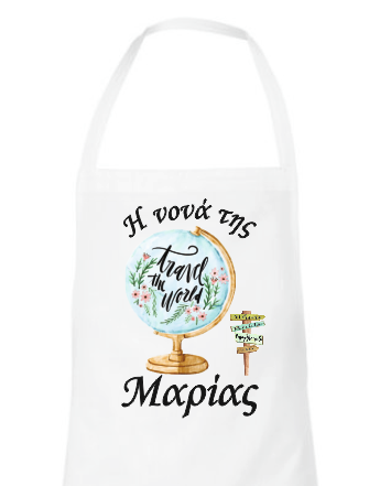 Λευκή ποδιά για το νονό ή τη νονά, εκτυπωμένη με θέμα "Travel the World". Γράψτε στα σχόλια μέσα στο καλάθι το όνομα του παιδιού σας.