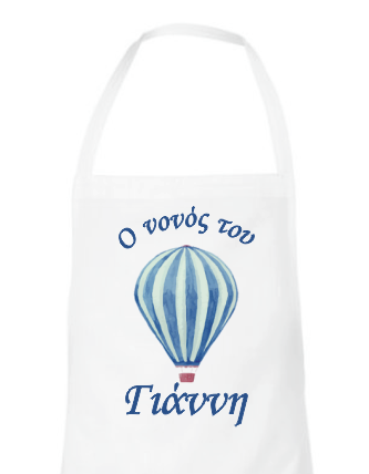 Λευκή ποδιά για το νονό ή τη νονά, εκτυπωμένη με θέμα "Αερόστατο". Γράψτε στα σχόλια μέσα στο καλάθι το όνομα του παιδιού σας. Με σιέλ ή ροζ αερόστατο.