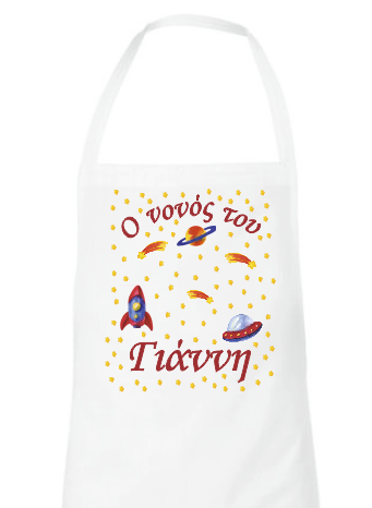 Λευκή ποδιά για το νονό ή τη νονά, εκτυπωμένη με θέμα "Διάστημα". Γράψτε στα σχόλια μέσα στο καλάθι το όνομα του παιδιού σας.