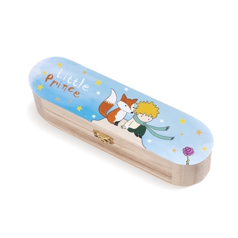 Ξύλινη natural κασετίνα με μεταλλικό κούμπωμα. Είναι διακοσμημένη με αυτοκόλλητο print μικρός πρίγκιπας.