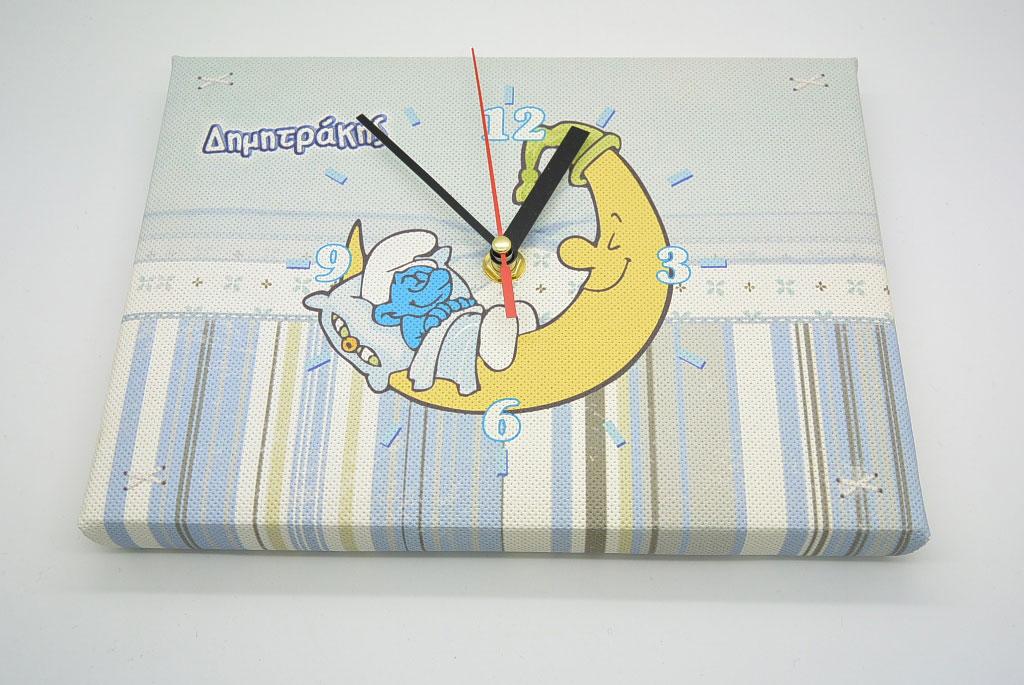 Καμβαδάκι Ρολόι στρουμφάκι σε διάσταση 17 x 24 cm για δωράκι. Μπορούμε να προσαρμόσουμε όποιο θέμα θέλετε.