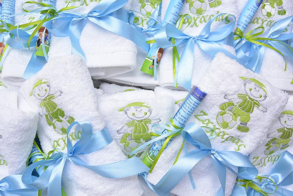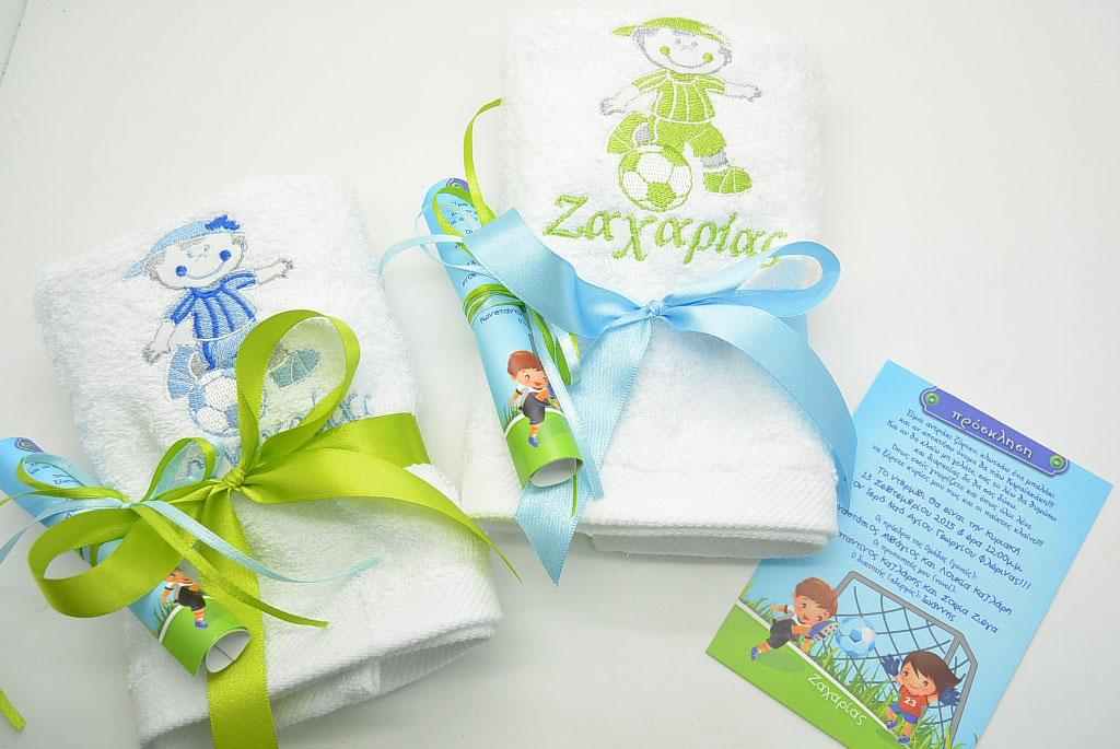 Μπομπονιέρα Προσκλητήριο ποδοσφαιριστής σε 2 αποχρώσεις με κεντημένο το όνομα του μωρού. Διάσταση πετσέτας 30 x 50 εκ και προσκλητηρίου 9 x 13 εκ. Η τιμή αφορά δεμένη μπομπονιέρα προσκλητήριο με 5 κουφέτα αμυγδάλου ή 9 smarties.