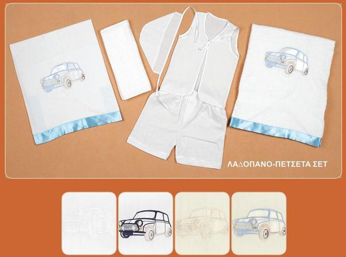 Λαδόπανα με θέμα αυτοκίνητο ελληνικής κατασκευής άριστης ποιότητας σε διάφορες αποχρώσεις. Το σετ περιλαμβάνει πετσέτα μικρή και μεγάλη, σεντονάκι και σετ εσώρουχα.