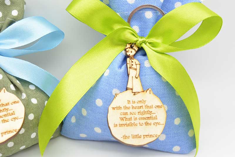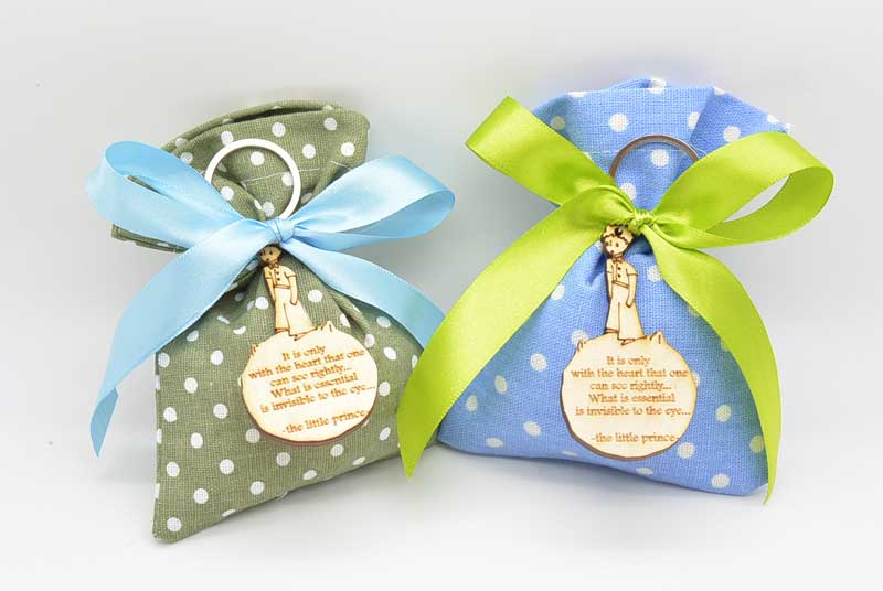 Μπομπονιέρα Βάπτισης πουγκάκι με μπρελόκ μικρός πρίγκιπας. Η τιμή περιλαμβάνει το δέσιμο της μπομπονιέρας με 5 κουφέτα αμυγδάλου ή 9 κουφετάκια smarties. Μπορεί να γίνει σε διάφορες αποχρώσεις.
