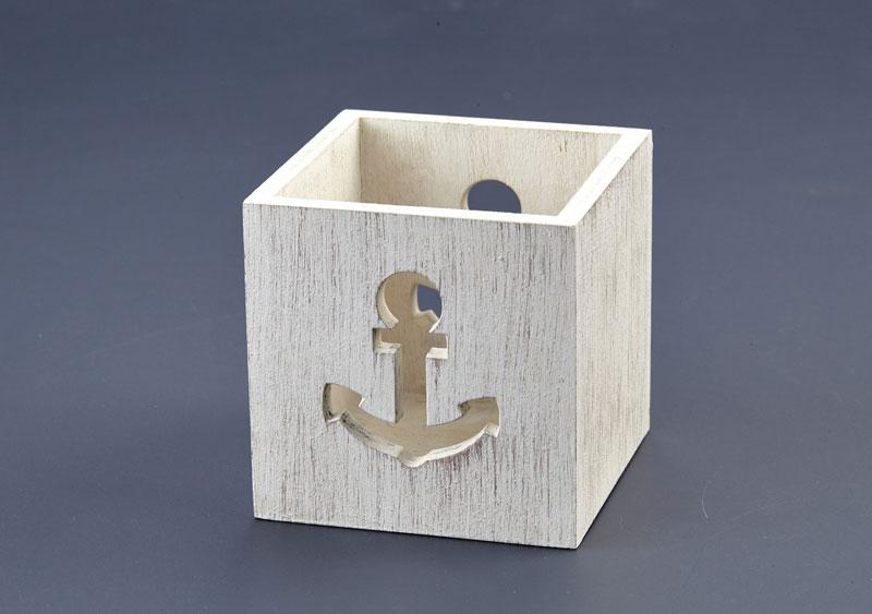 Μπομπονιέρα Βάπτισης ξύλινο κουτάκι για ρεσώ ή μολυβοθήκη με σχέδιο άγκυρα. Η τιμή αφορά δεμένη μπομπονιέρα με 5 κουφέτα αμυγδάλου ή 9 κουφετάκια smarties. Διάσταση 6,5 x 6,5 cm.