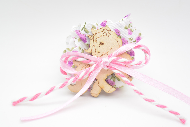 Κέρασμα Γέννας με διακοσμητικό ξύλινο μονόκερος. Μπορεί να γίνει σε διάφορες αποχρώσεις. Η τιμή αφορά δεμένο με 2 κουφέτα αμυγδάλου.