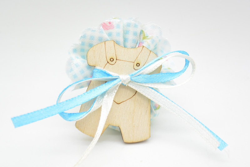 Κέρασμα Γέννας με διακοσμητικό ξύλινο φορμάκι. Μπορεί να γίνει σε διάφορες αποχρώσεις. Η τιμή αφορά δεμένο με 2 κουφέτα αμυγδάλου.