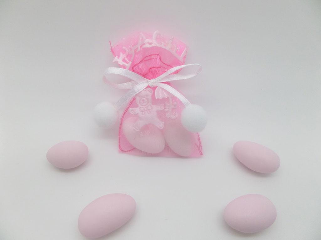 Κέρασμα γέννας με πουγκί οργάντζα με διακοσμητικό αρκουδάκι με διαστάσεις 5 x 7.5 cm. Μπορεί να γίνει και σε σιέλ χρώμα. Η τιμή περιλαμβάνει 2 κουφέτα.