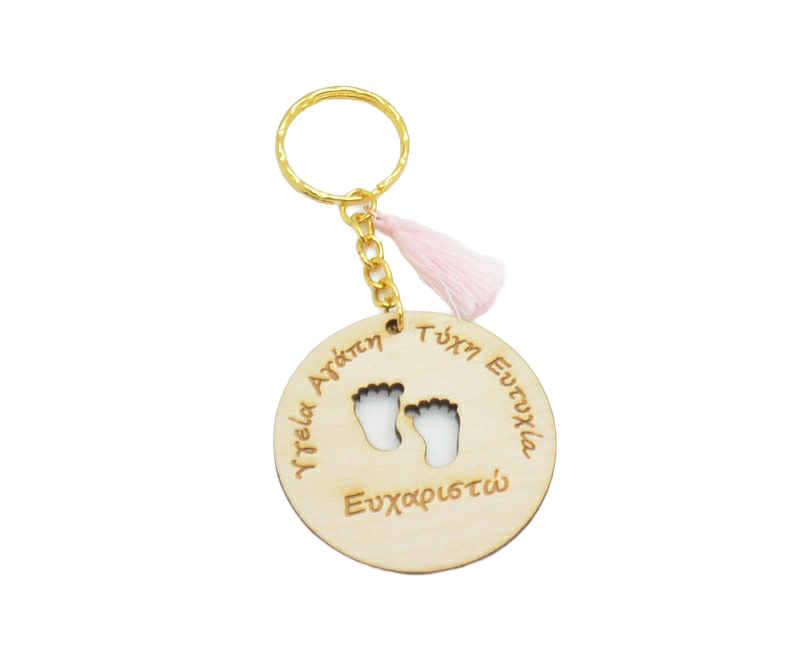Κεράσματα Γέννας | Ξύλινο Μπρελόκ πατουσάκια με φούντα και ευχές (5123203)