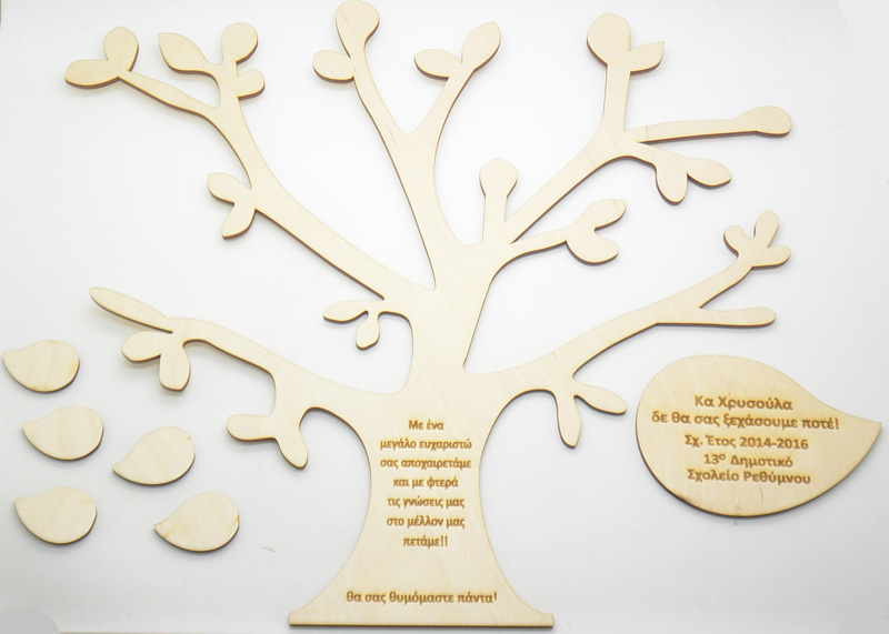 Αναμνηστικό δώρο δέντρο για την δασκάλα ή τον δάσκαλο με διαστάσεις 40 x 36 εκ. Μπορείτε να γράψετε ότι κείμενο θέλετε. Η τιμή περιλαμβάνει το δέντρο και 25 ξύλινα φύλλα για να γράψετε τα ονόματα των μαθητών. Μπορεί να γίνει χάραξη των ονομάτων των μαθητών απο εμάς με έξτρα χρέωση.