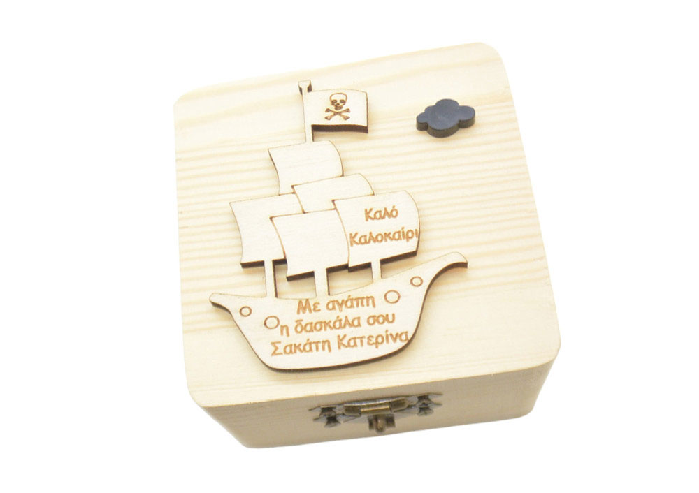 Αναμνηστικό Ξύλινο κουτί πειρατικό καράβι με αφιέρωση της επιλογής σας δώρο από την δασκάλα ή τον δάσκαλο. Διαστάσεις 8 x 8 x 5 εκ.