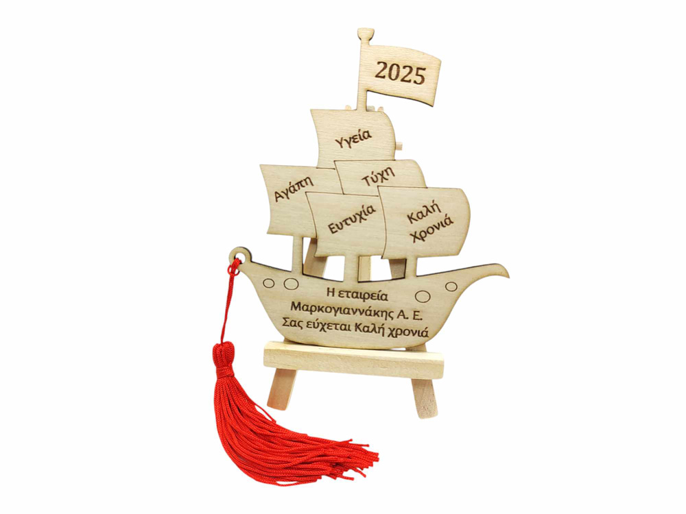 Ξύλινα Γούρια 2026 | Ξύλινο Γούρι καράβι με καβαλέτο για επιχειρήσεις συλλόγους σχολεία (195761)