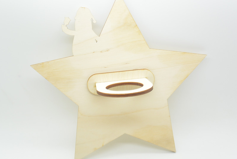 Ξύλινη κορυφή χριστουγεννιάτικου δέντρου αστέρι με σχέδιο αγγελάκι. Στο εσωτερικό γίνεται χάραξη τα ονόματα της οικογένειας. Διάσταση 23 x 21 εκ.