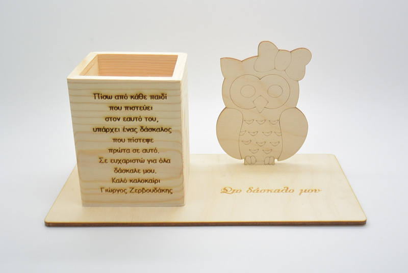 Αναμνηστικό για δάσκαλο καλό καλοκαίρι με διάσταση, βάση 23,5 x 12 εκ, μολυβοθήκη 8 x 8 x 10 εκ, κουκουβάγια 11,3 x 8 εκ .