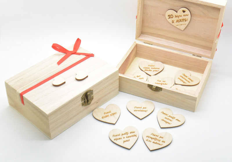 Σετ ξύλινο κουτί με 10 καρδιές στολισμένο για δωράκι Αγίου Βαλεντίνου με ευχές για των αγαπημένο ή την αγαπημένη σας.
