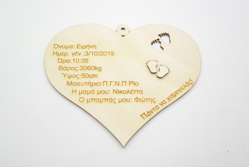 Ξύλινο Αναμνηστικό Γέννησης καρδιά.  Διάσταση 20 x 17 εκ. Το κείμενο μπορεί να αλλάξει και να μπει της επιλογής σας.