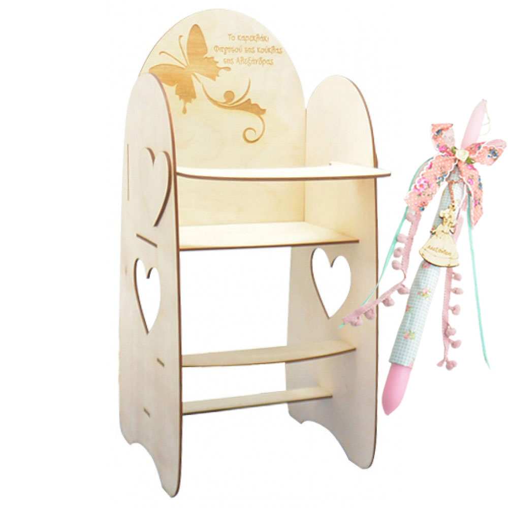 Καρεκλάκι φαγητού κούκλας με σχέδιο πεταλούδα. Διαστάσεις 55 x 26 εκ. Το όνομα μπορεί να αλλάξει όπως και το σχέδιο στην πλάτη και στο πλάι. Δώρο η πασχαλινή λαμπάδα!!