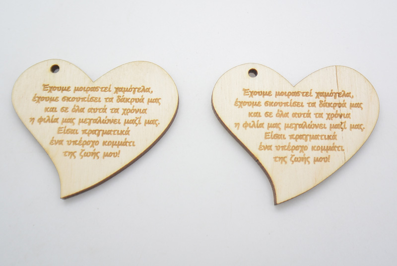 Ξύλινο διακοσμητικό καρδιά δώρο για την καλύτερη σας φίλη. Μπορεί να γίνει μπρελόκ και να επιλέξετε το κείμενο που θα χαραχτεί. Διάσταση 6 x 5,1 εκ.