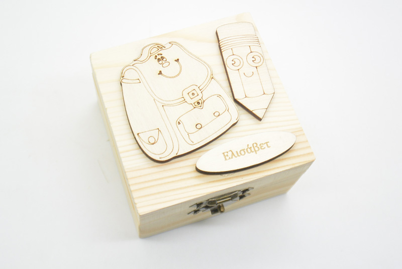 Αναμνηστικό Ξύλινο κουτί τσάντα μολύβι με το όνομα του κάθε παιδιού δώρο από την δασκάλα. Διαστάσεις 8 x 8 x 5 εκ.