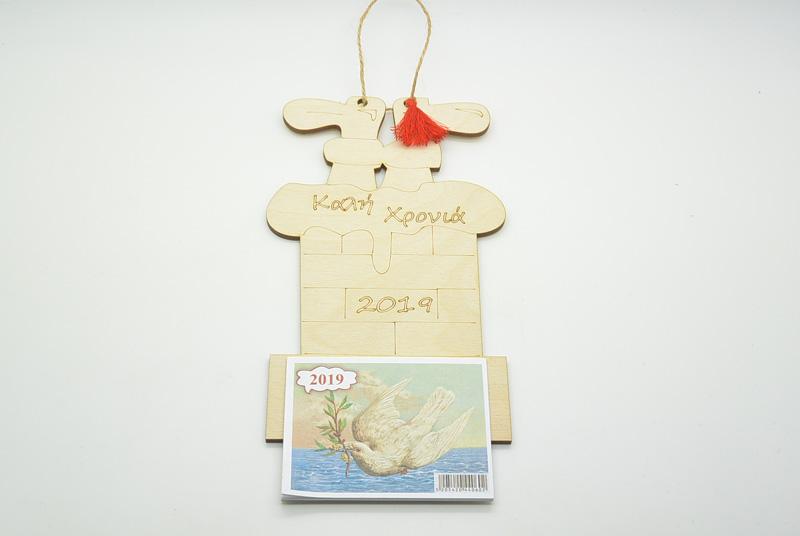 Ξύλινο Ημερολόγιο τοίχου με σχέδιο καμινάδα για σχολεία και συλλόγους με διάσταση ξύλου 20 x 12 cm. Μπορούν να χαρακτούν τα στοιχεία του εκάστοτε σχολείου ή συλλόγου. Η τιμή αφορά ποσότητες απο 50 εώς 200 τεμάχια. Ειδικές τιμές σε μεγαλύτερες ποσότητες και στην περίπτωση που θέλετε μόνο τα υλικά.