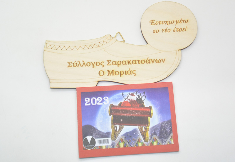 Ξύλινο Ημερολόγιο τοίχου τσαρούχι για συλλογούς με διάσταση 16 εκ μήκος μαζί με το ημερολόγιο x 16 εκ πλάτος. Μπορούν να χαρακτούν τα στοιχεία του εκάστοτε συλλόγου. Η τιμή αφορά ποσότητες απο 50 εώς 200 τεμάχια. Στην τιμή περιλαμβάνονται όλα τα υλικά ξύλινο διακοσμητικό, ημερολόγιο και γαντζάκι για να κρεμαστεί. Με επιπλέον χρέωση 0,20 μπορείτε να το πάρετε έτοιμο κολλημένα τα στοιχεία απο εμάς.