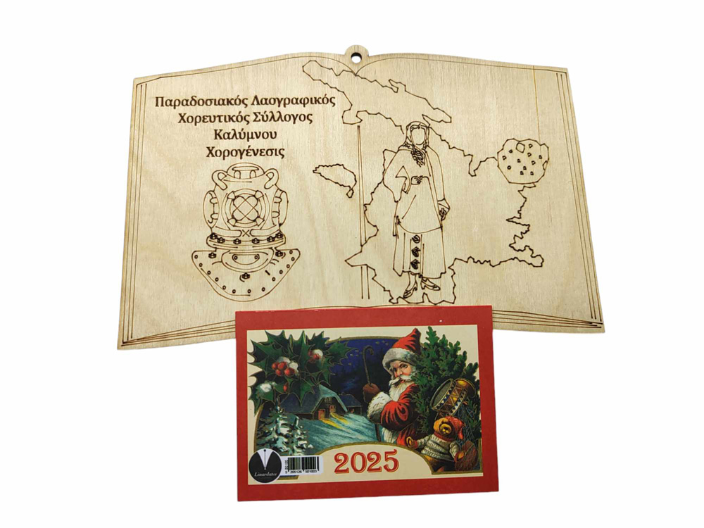 Ξύλινο Ημερολόγιο τοίχου βιβλίο για συλλογούς ή σχολεία με διάσταση 17 εκ ύψος μαζί με το ημερολόγιο x 18 εκ πλάτος. Μπορούν να χαρακτούν τα στοιχεία του εκάστοτε συλλόγου. Η τιμή αφορά ποσότητες απο 50 εώς 200 τεμάχια. Στην τιμή περιλαμβάνονται όλα τα υλικά ξύλινο διακοσμητικό, και ημερολόγιο. Με επιπλέον χρέωση 0,20 μπορείτε να το πάρετε έτοιμο κολλημένα τα στοιχεία απο εμάς.