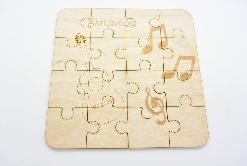 Ξύλινο παζλ κιθάρα μουσική. Διάσταση 15 x 15 cm. Η τιμή αφορά σκέτο το αντικείμενο. Απο το υπομενού μπορείτε να επιλέξετε με επιπλέον χρέωση να γίνει δεμένη μπομπονιέρα με 5 κουφέτα αμυγδάλου ή 9 smarties. Μπορεί να γραφτεί το όνομα του παιδιού σας.