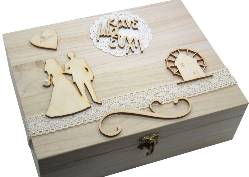 Ξύλινο Κουτί ευχών για γάμο με σχέδιο γαμπρός νύφη και σχέδιο ανεμόμυλος. Διαστάσεις κουτιού 32 x 25 x 11 εκ. Μπορεί να συνδιαστεί με ξύλινες καρδιές με επιπλέον χρέωση.