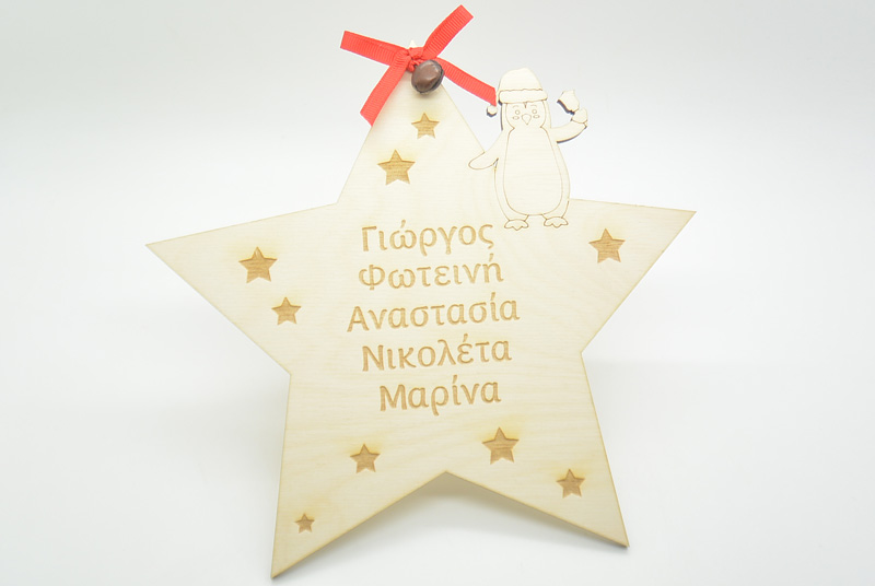 Ξύλινη κορυφή χριστουγεννιάτικου δέντρου αστέρι με σχέδιο πιγκουίνο. Στο εσωτερικό γίνεται χάραξη τα ονόματα της οικογένειας. Διάσταση 21 x 20 εκ.