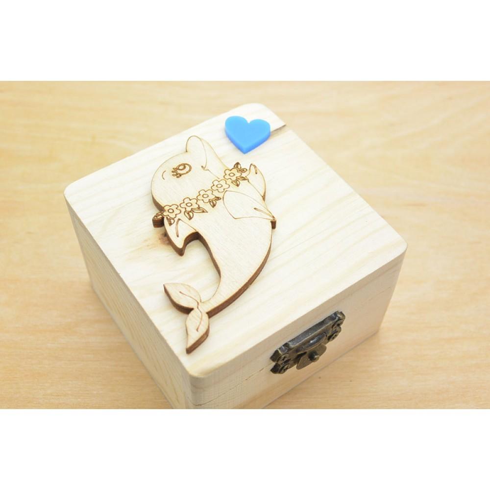 Ξύλινο κουτί δελφινάκι με λεπτομέρειες plexiglass μπορείτε να επιλέξετε το χρώμα στις λεπτομέρειες plexiglass. Διάσταση κουτί 8 x 8 x 5  cm.