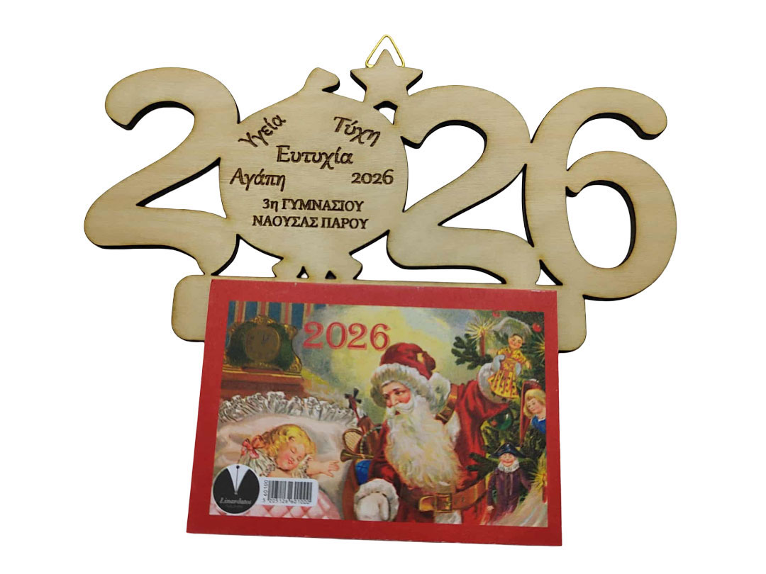 Ξύλινο Ημερολόγιο τοίχου με ρόδι και σχέδιο 2026 για σχολεία και συλλόγους με διάσταση 15 μήκος μαζί με το ημερολόγιο x 17 εκ πλάτος. Μπορούν να χαρακτούν τα στοιχεία του εκάστοτε σχολείου ή συλλόγου. Η τιμή αφορά ποσότητες απο 50 εώς 200 τεμάχια. Στην τιμή περιλαμβάνονται όλα τα υλικά ξύλινο διακοσμητικό, ημερολόγιο και γαντζάκι για να κρεμαστεί. Με επιπλέον χρέωση 0,20 μπορείτε να το πάρετε έτοιμο κολλημένα τα στοιχεία απο εμάς.
