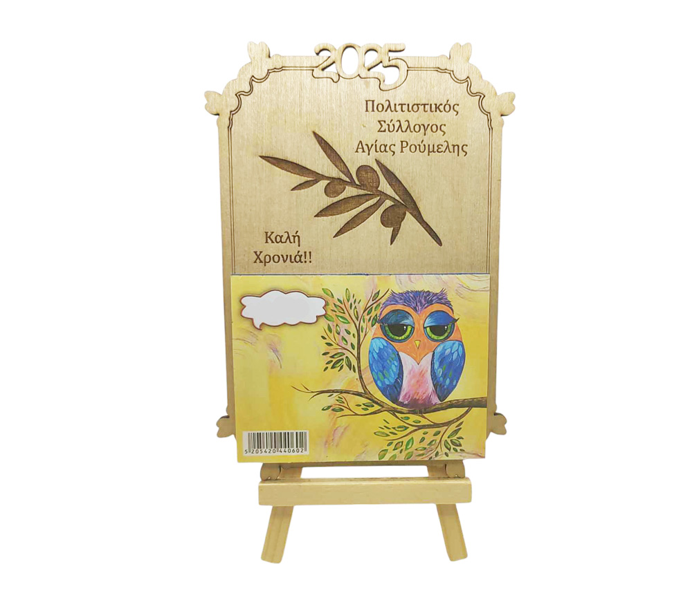 Ξύλινο Ημερολόγιο μηνιαίο με καβαλέτο και σχέδιο ελιά με κλαδιά για συλλόγους με διαστάσεις 16 x 11 εκ το ημερολόγιο και ύψος 19 εκ με το καβαλέτο. Μπορούμε να χαράξουμε το κείμενο της επιλογής σας, για επιχειρήσεις συλλόγους, συνδέσμους, σχολεία κτλ. Αποστέλλετε έτοιμο!!