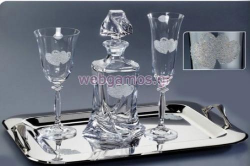 Πλήρες Σετ κουμπάρου το οποίο περιλαμβάνει δίσκο, καράφα κρυστάλλινη, ποτήρι κρυστάλλινο ψηλό ή χαμηλό στολίσμένα και στέφανα ασημένια της αρεσκείας σας.