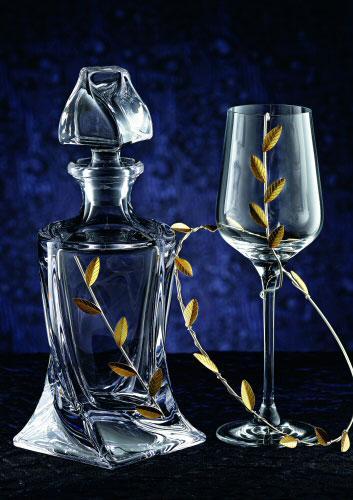 Σετ Γάμου με θέμα ελιά στολισμένο. Το σετ περιλαμβάνει καράφα και ποτήρι κρυστάλλινα και στέφανα ασημένια με αμμοβολή.