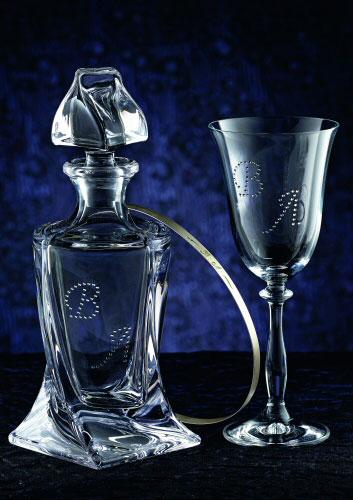 Σετ Γάμου με τα μονογράμματα του ζευγαριού στολισμένο. Το σετ περιλαμβάνει καράφα και ποτήρι κρυστάλλινα και στέφανα ασημένια με αμμοβολή.