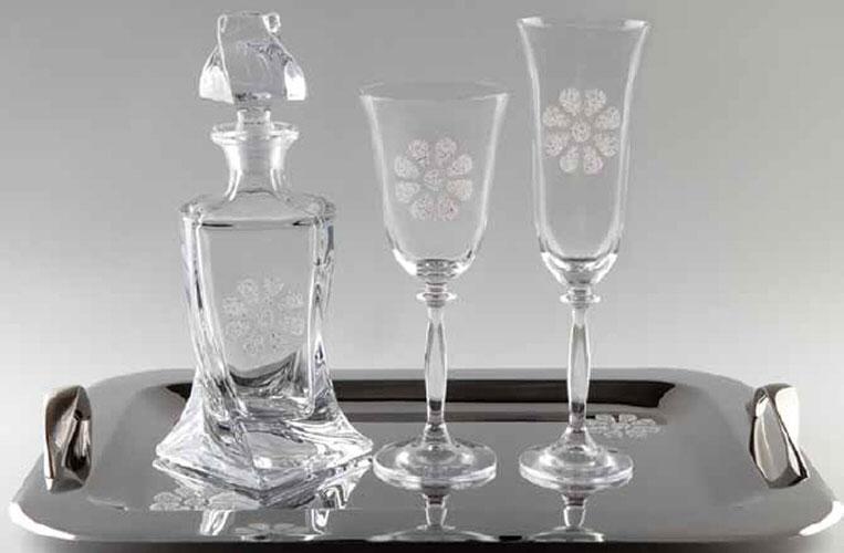 Σετ Γάμου με σχέδιο λουλούδια στόλισμενο απο κρύσταλλάκια swarovski. Το σετ περιλαμβάνει καράφα και ποτήρι κρυστάλλινα, δίσκο και στέφανα επάργυρα με κωδικό 7204. Μπορείτε να επιλέξετε ανάμεσα σε ποτήρι κρασιού ή σαμπάνιας.