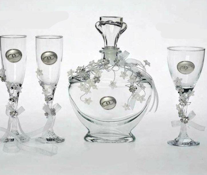 Σετ Καράφα ποτήρι στολισμένα σε αποχρώσεις του λευκού - ασημί με σχέδιο βέρες. Η τιμή περιλαμβάνει καράφα και ποτήρι της επιλογής σας. Μπορείτε να επιλέξετε ανάμεσα σε κρασιού και σαμπάνιας.