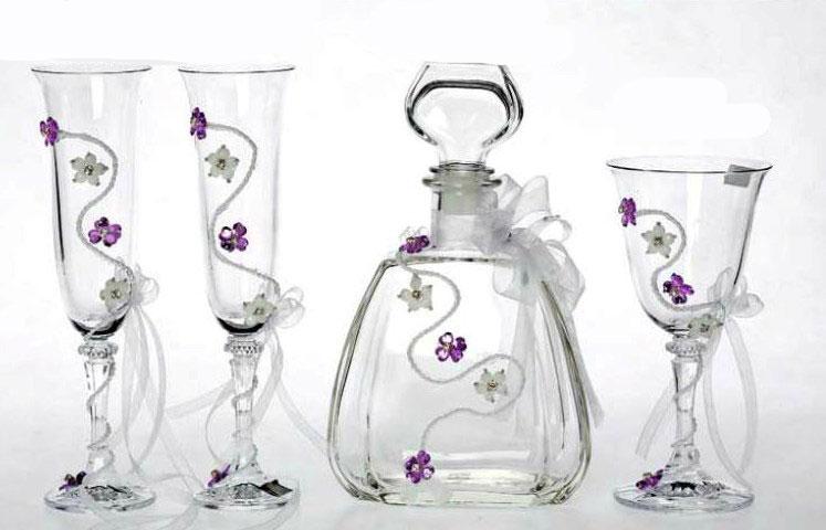 Σετ Καράφα ποτήρι στολισμένα σε αποχρώσεις του λευκού - λιλά. Η τιμή περιλαμβάνει καράφα και ποτήρι της επιλογής σας. Μπορείτε να επιλέξετε ανάμεσα σε κρασιού και σαμπάνιας.