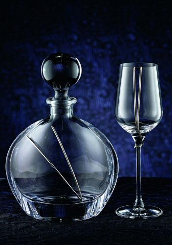 Κρυστάλλινο Σετ το οποίο περιλαμβάνει καράφα και ποτήρι για γάμο ή αρραβώνα, διακοσμημένα με λεπτομέρειες ασήμι. Μπορείτε να επιλέξετε ανάμεσα σε ποτήρι κρασιού ή σαμπάνιας.