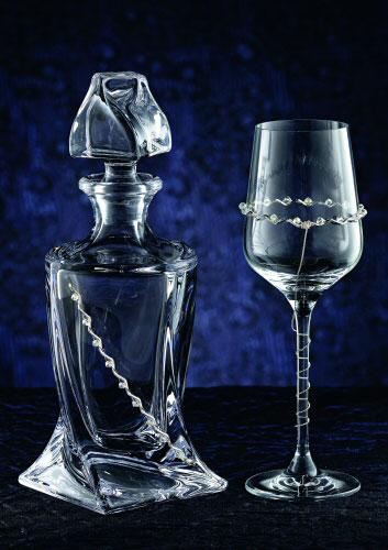 Κρυστάλλινο Σετ το οποίο περιλαμβάνει καράφα και ποτήρι για γάμο ή αρραβώνα, διακοσμημένα με λεπτομέρειες ασήμι και κρυσταλλάκια swarovski. Μπορείτε να επιλέξετε ανάμεσα σε ποτήρι κρασιού ή σαμπάνιας.